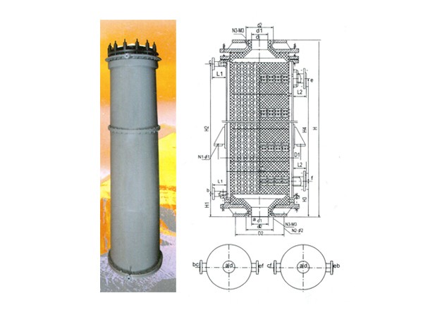YKCH型圓塊孔式石墨硫酸稀釋冷卻器由石墨制混酸器與圓塊孔式石墨冷 卻器組合而成,亦可用作其它物料放熱性 稀釋、混合、冷卻。本公司亦生產LS型石墨硫酸稀釋冷卻器及混酸與冷卻分體之I型、II型組合硫酸稀釋冷卻系統。圖示為冷卻器結構圖。技術特性: 縱向 橫向設計壓力Mpa ≤0.1 ≤0.4設計溫度℃ -20 ~ 165 (按中徑計)換熱面積㎡ HG/T3188-2000技術標準:HG